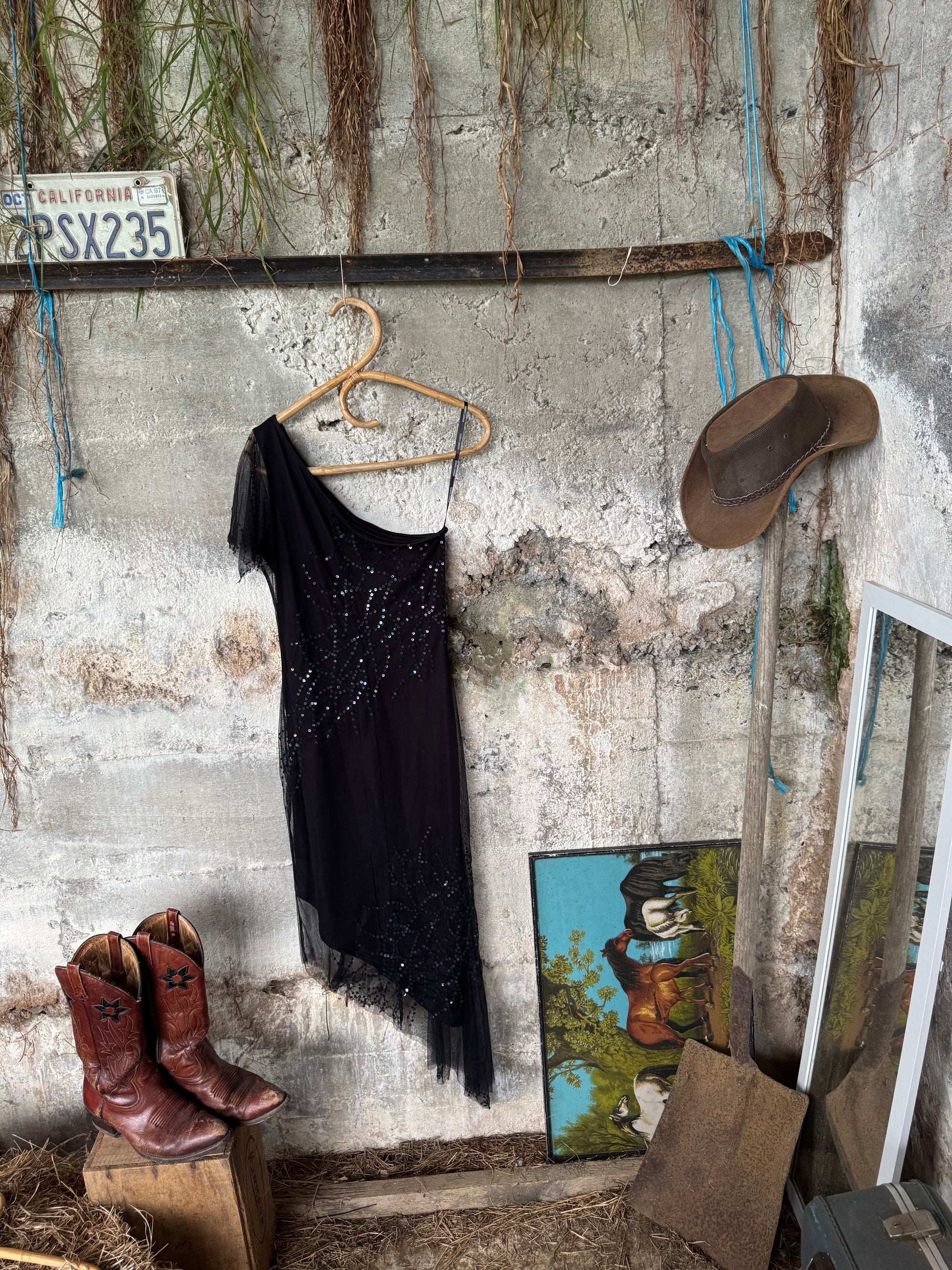 One sleeve mesh sequin dress with asymmetrical hem line