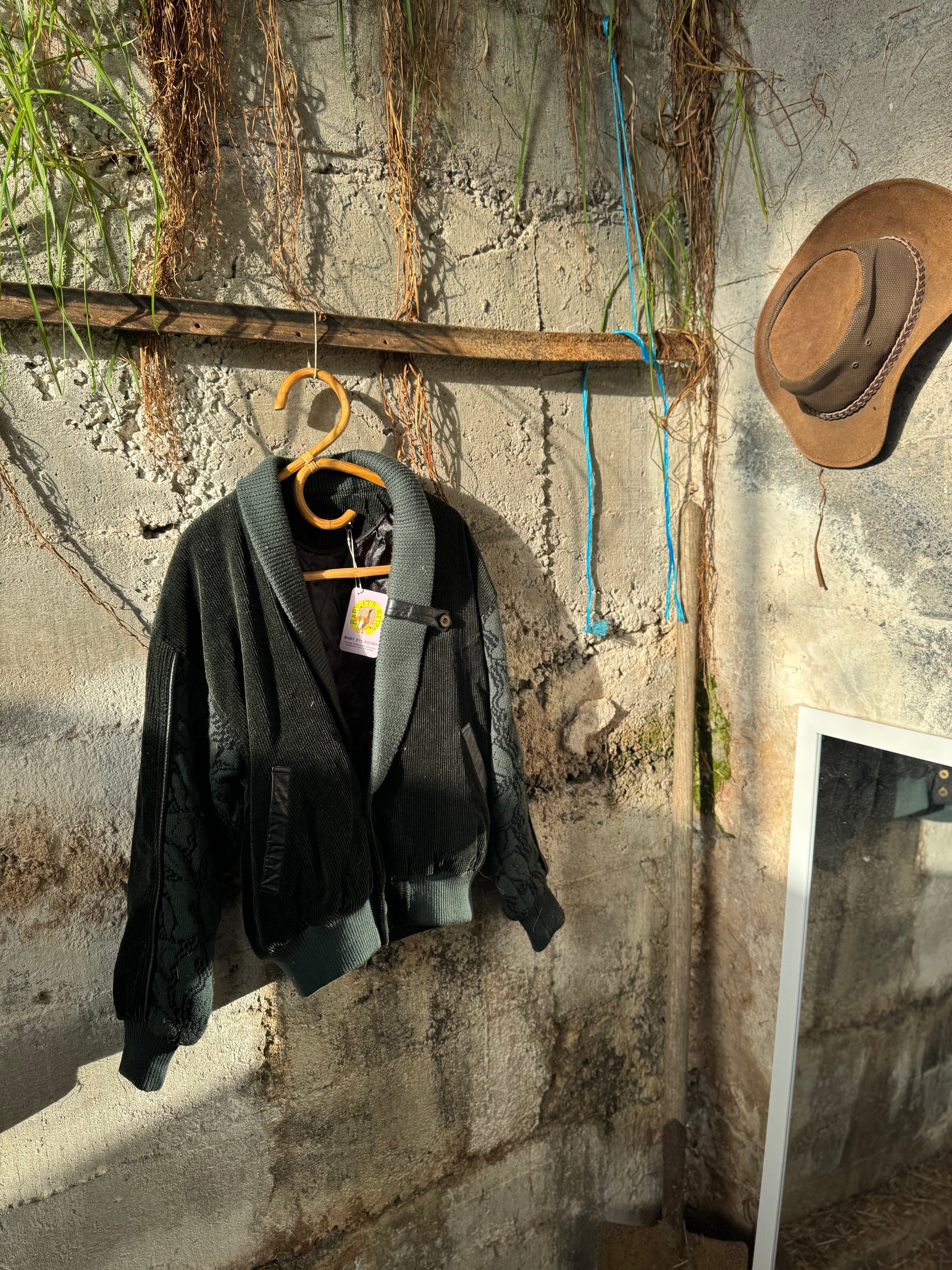 Corduroy, leather and knitted bomber jacket. Unsure of composition.