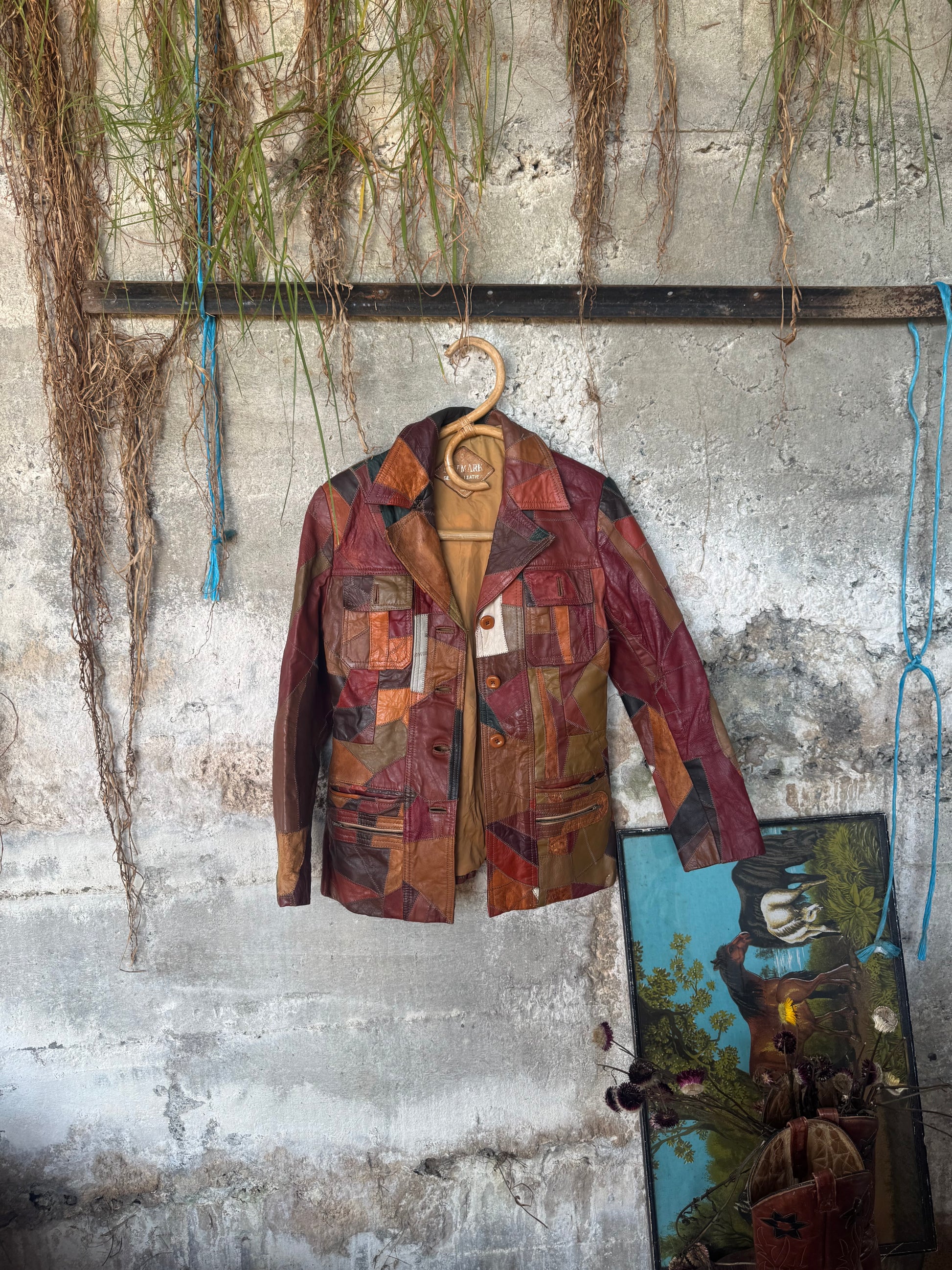 Authentic vintage patchwork leather jacket from the late ’70s–’80s, constructed from stitched leather off-cuts — no two panels or jackets are the same.