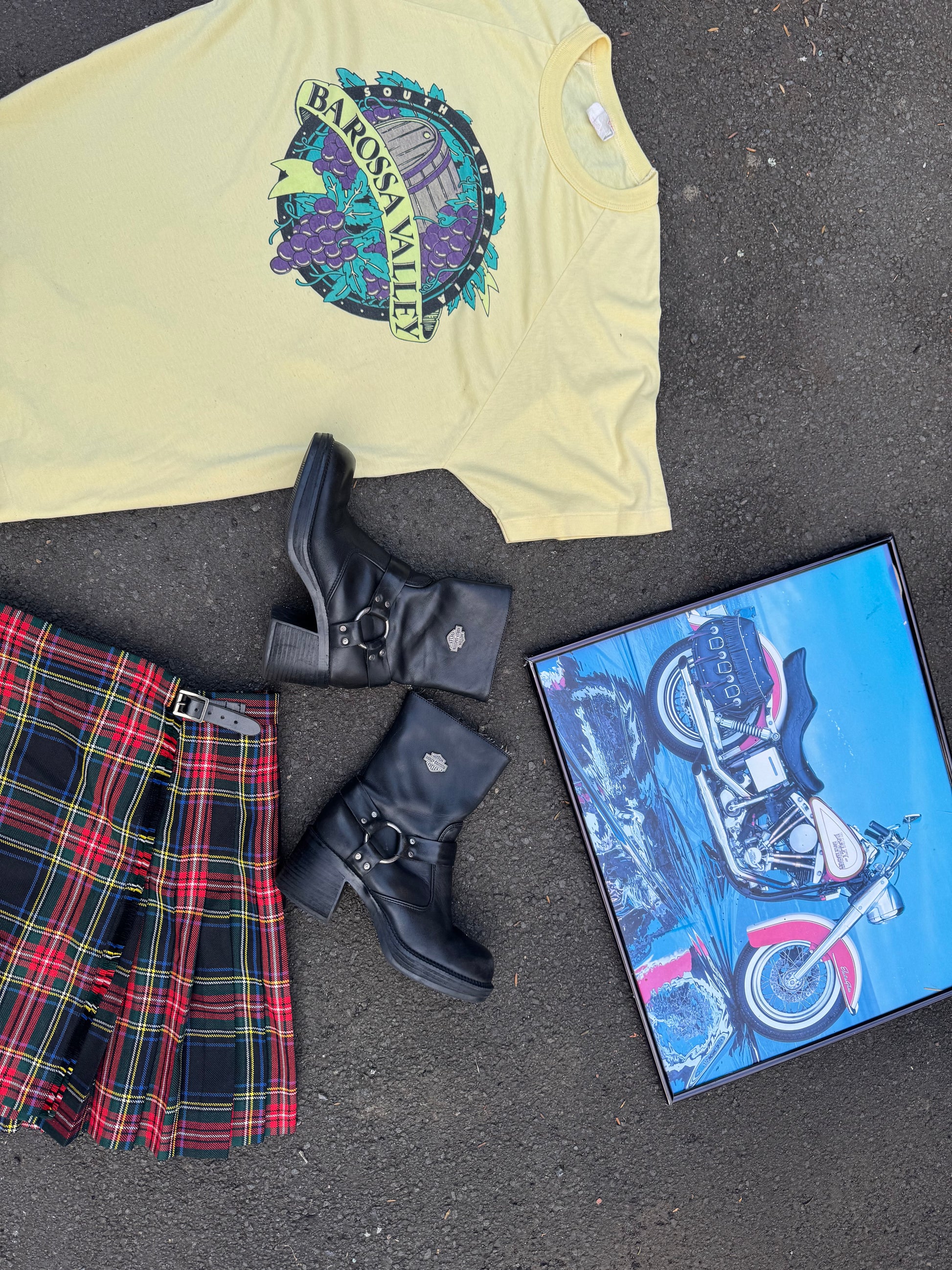 Light lemon cotton Tee, with Barrossa Valley and grapes print. Such a cute vintage Tee & even better if you enjoy a glass or 2 of Barrossa Valley wine.